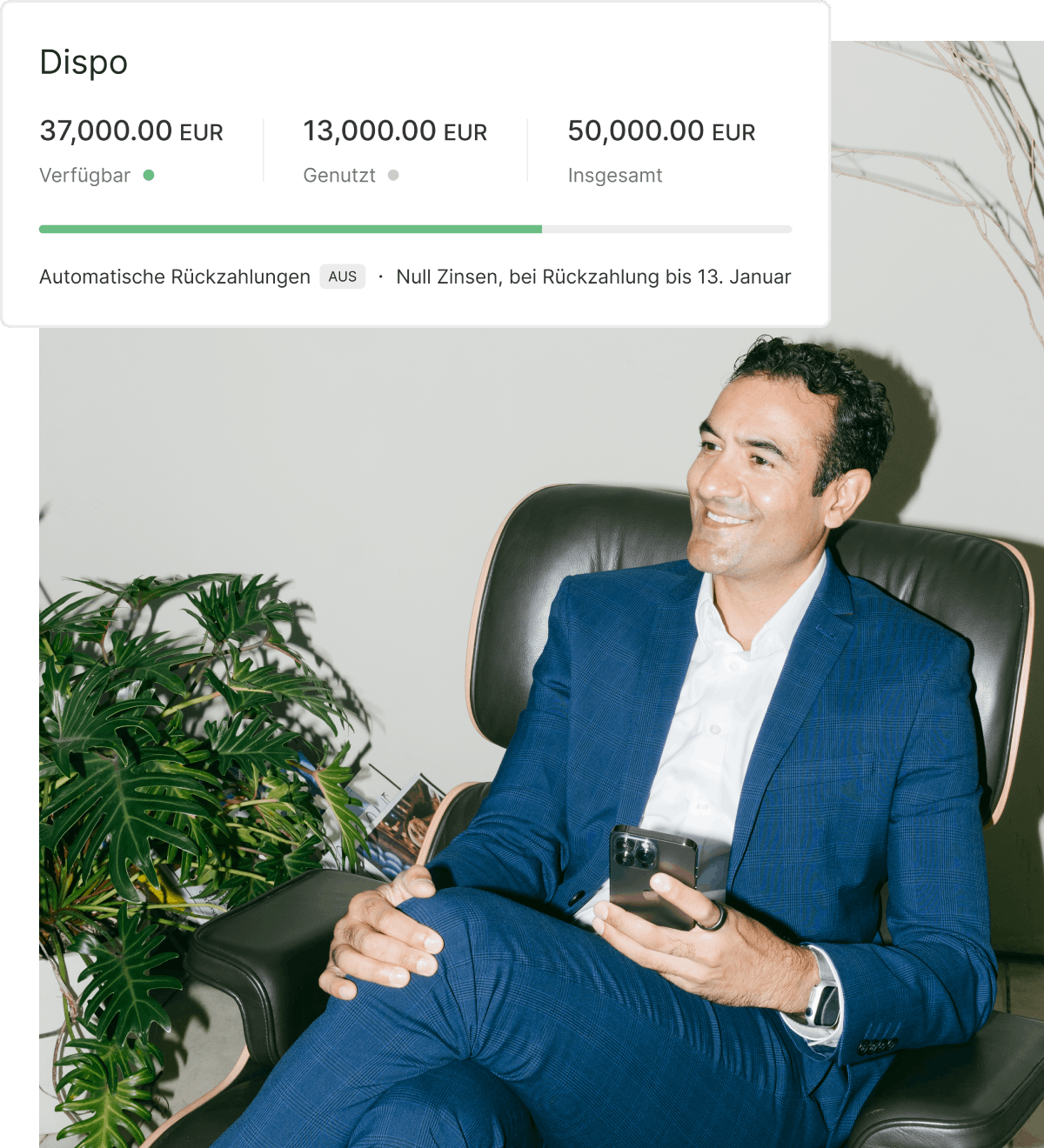 Cashflow-Management kann nervenaufreibend sein. Mit unserem Überziehungskredit wickeln Sie wichtige Zahlungen reibungslos ohne Engpässe fristgerecht ab. Und das Beste daran? Pleo-Dispo ist bei pünktlichem Ausgleich völlig zinsfrei!