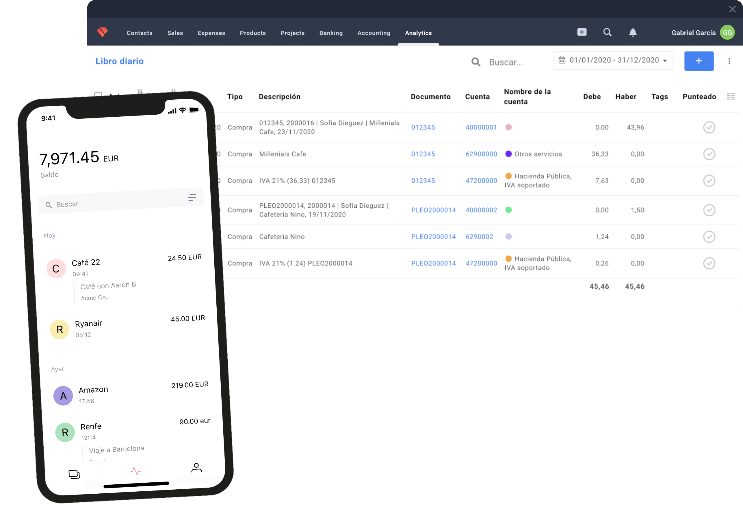 Tus gastos de Pleo se sincronizan con tus cuentas contables tal y como están en Holded. Incluye recibos, códigos de IVA, proveedores y mucho más.