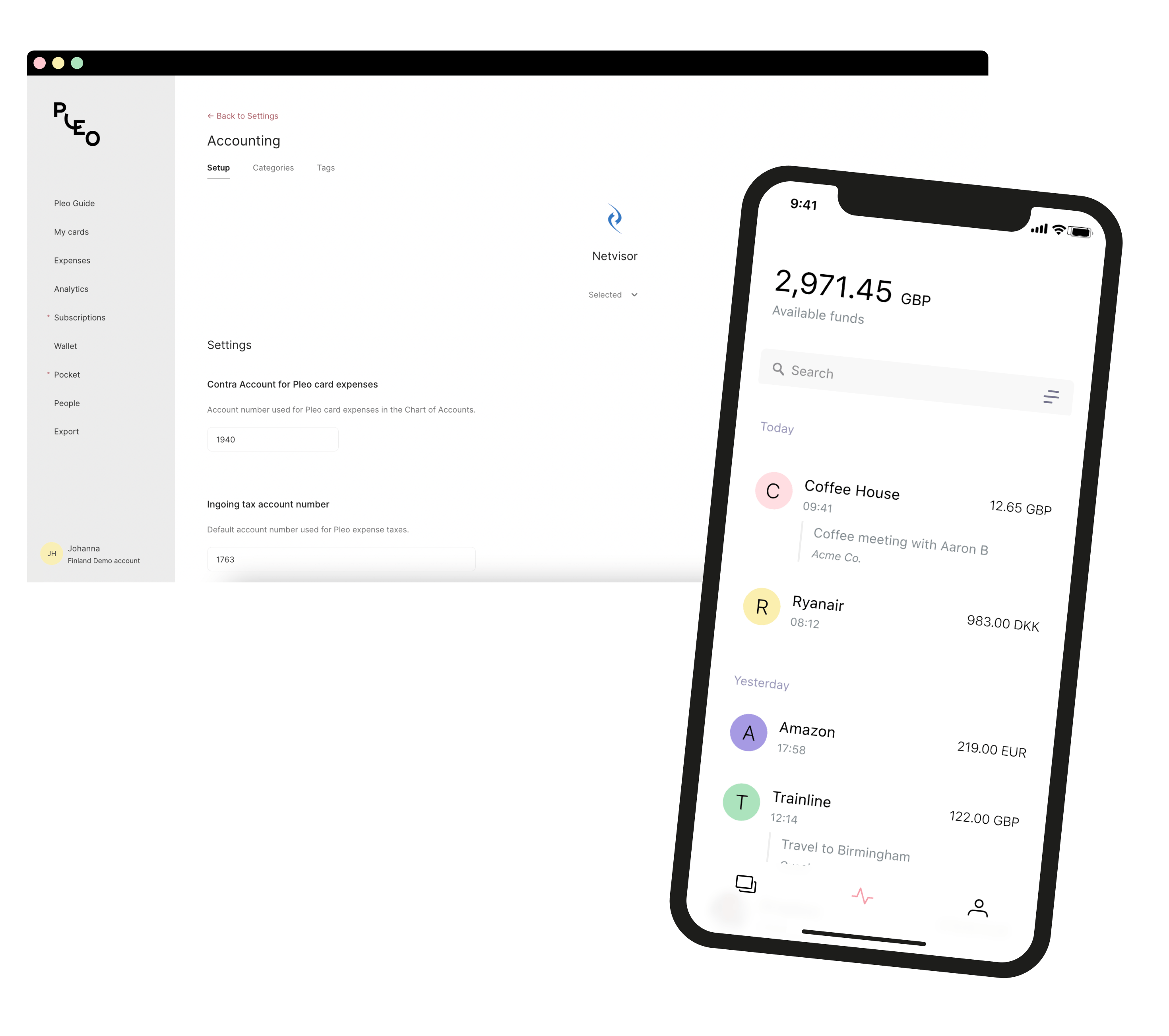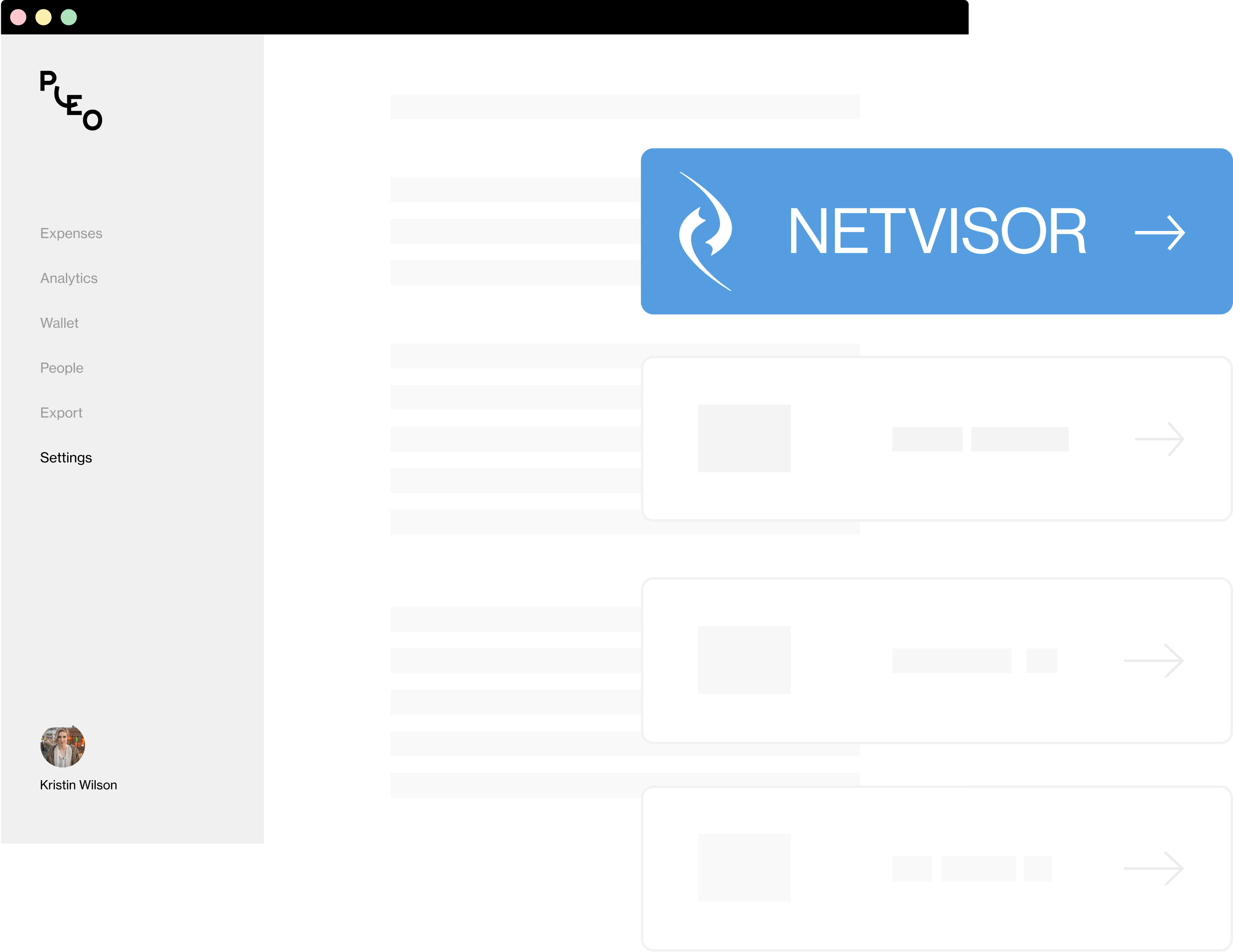 Kun kirjaudut sisään Pleo tilillesi, suuntaa ‘Asetukset’ kohtaan ja valitse Netvisor kirjanpidon formaatiksi. Syötä kirjanpitotilisi ja ALV-koodit, joita haluat Pleossa käyttää. Tämä on nopea prosessi ja sinun ei tarvitse tehdä tätä useammin kuin yhden kerran.