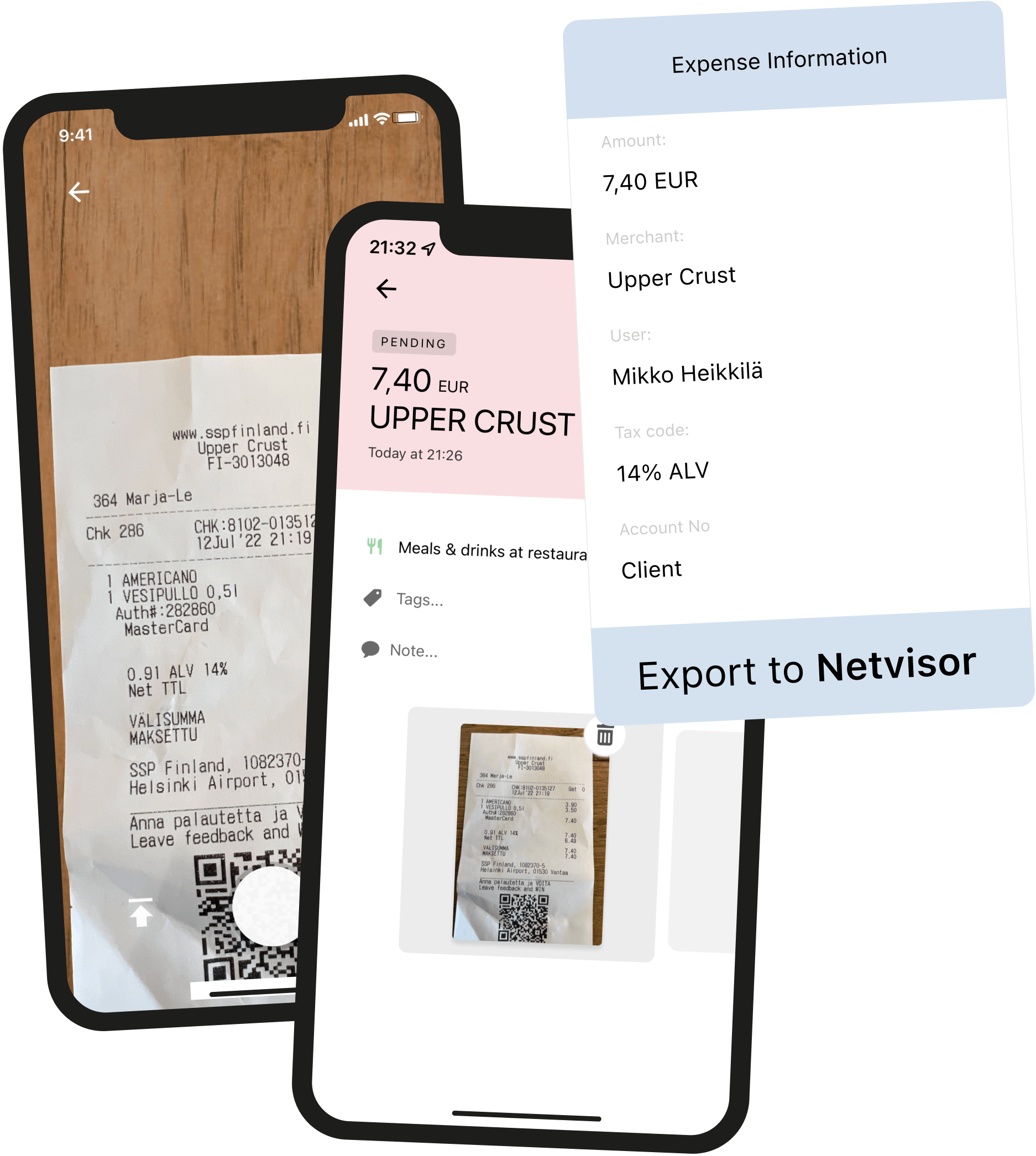 Syötä vain ostoksen tiedot ja kuitti, ja tiedot yhdistetään oikeisiin kirjanpitotileihin ja ALV-koodeihin Netvisorissa.