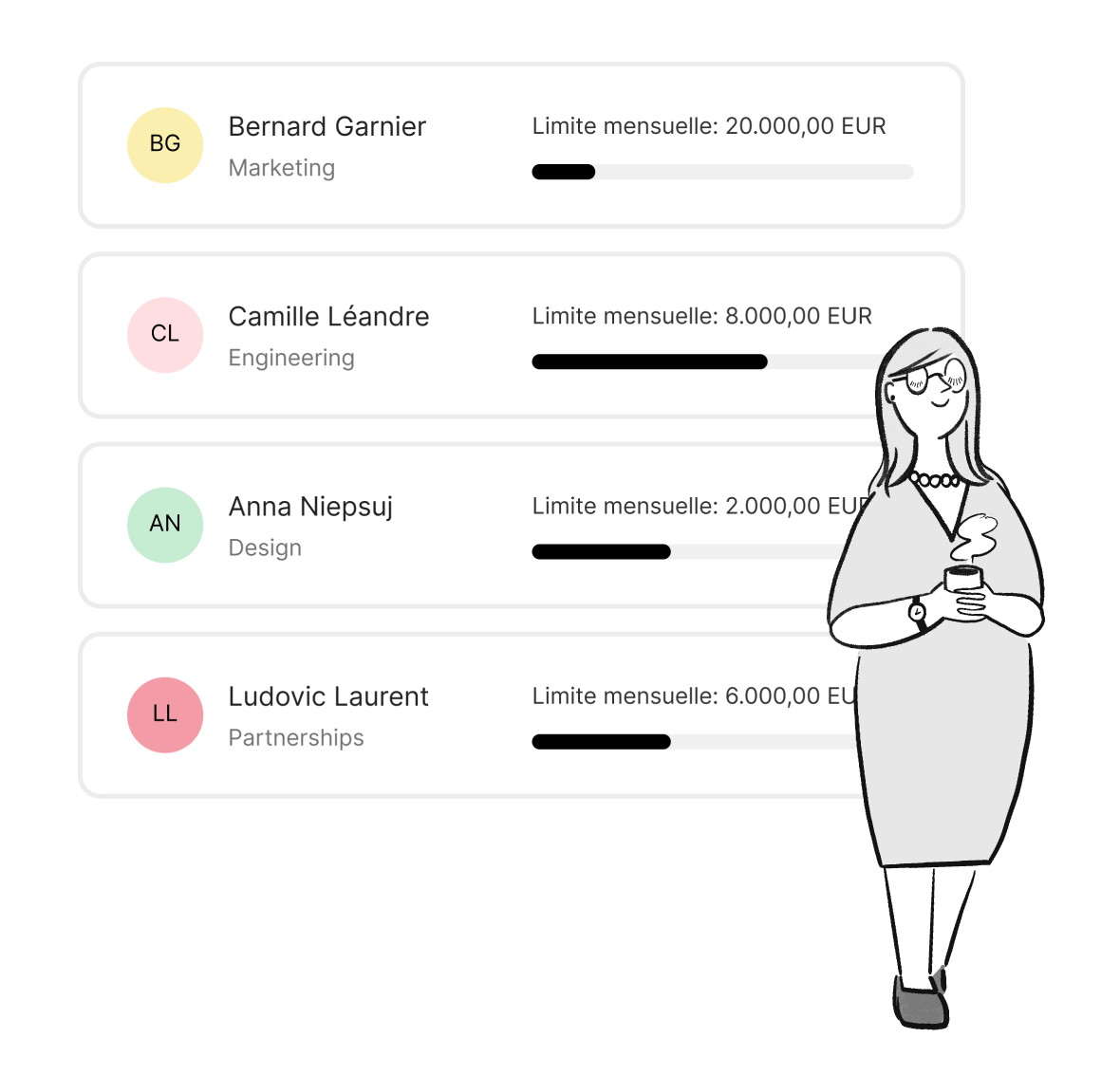 Grâce à nos autorisations personnalisables, finies les dépenses indésirables. Commencez par définir des limites de dépenses par mois, par utilisateur ou par achat. Vous pouvez également choisir la façon dont vous souhaitez rembourser vos employés afin d’avoir le contrôle total de votre trésorerie.
