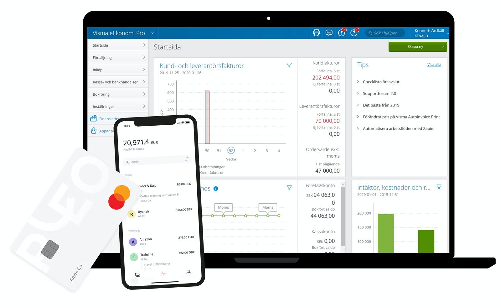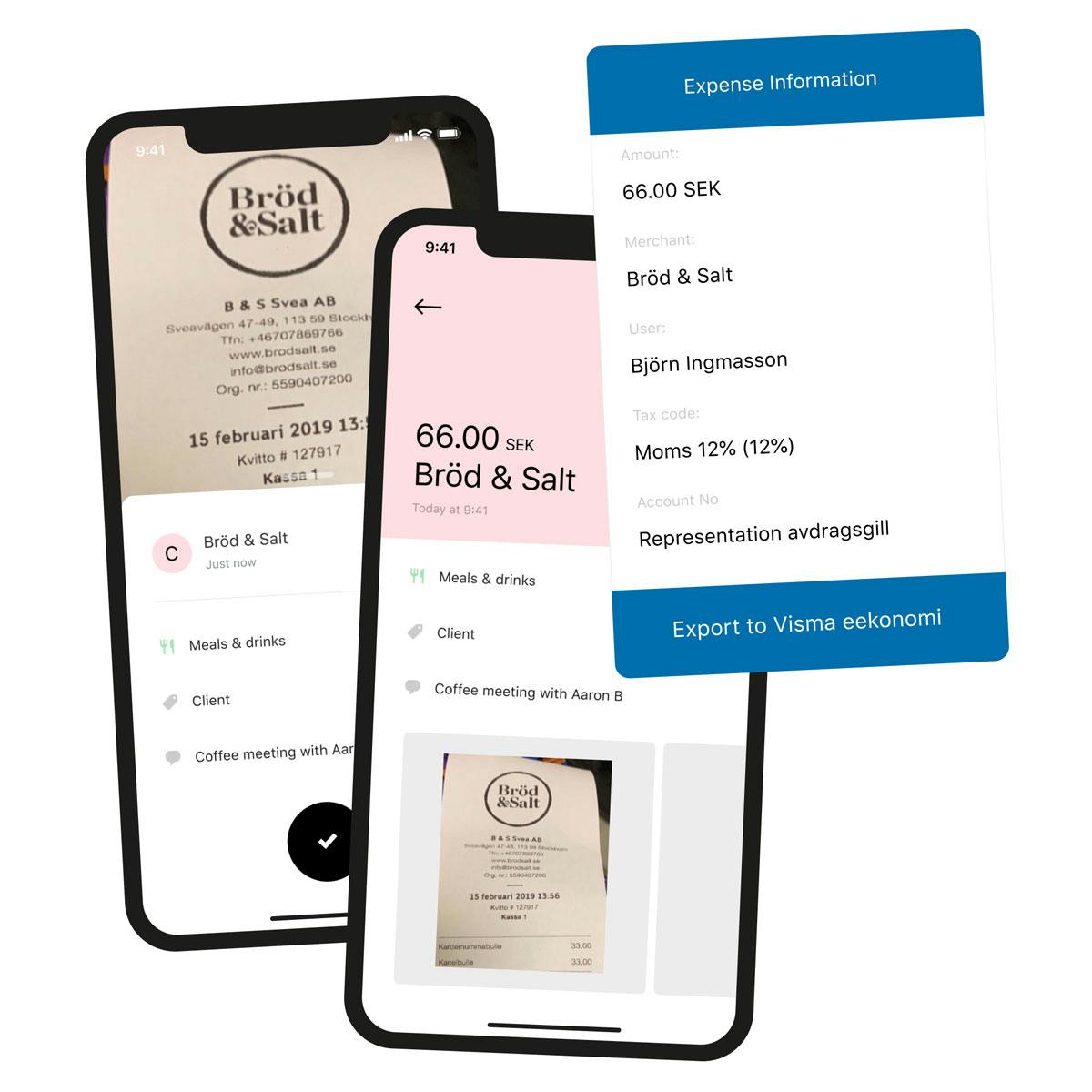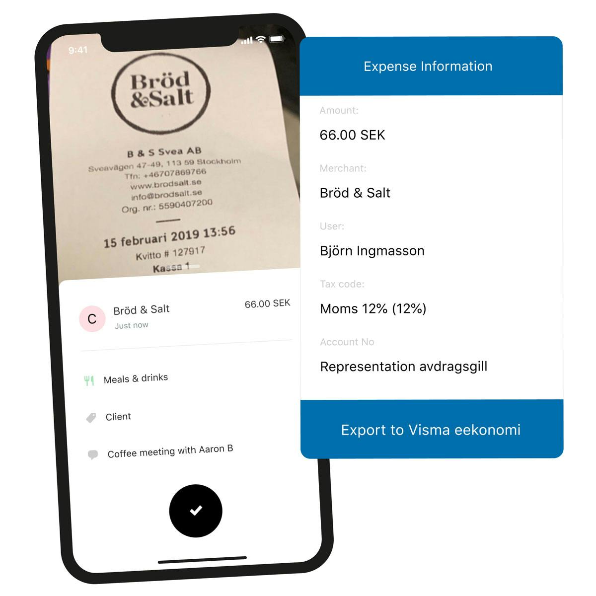 Kvitton, kontonummer och kommentarer förs över till Visma eEkonomi för att matcha din bokföring.