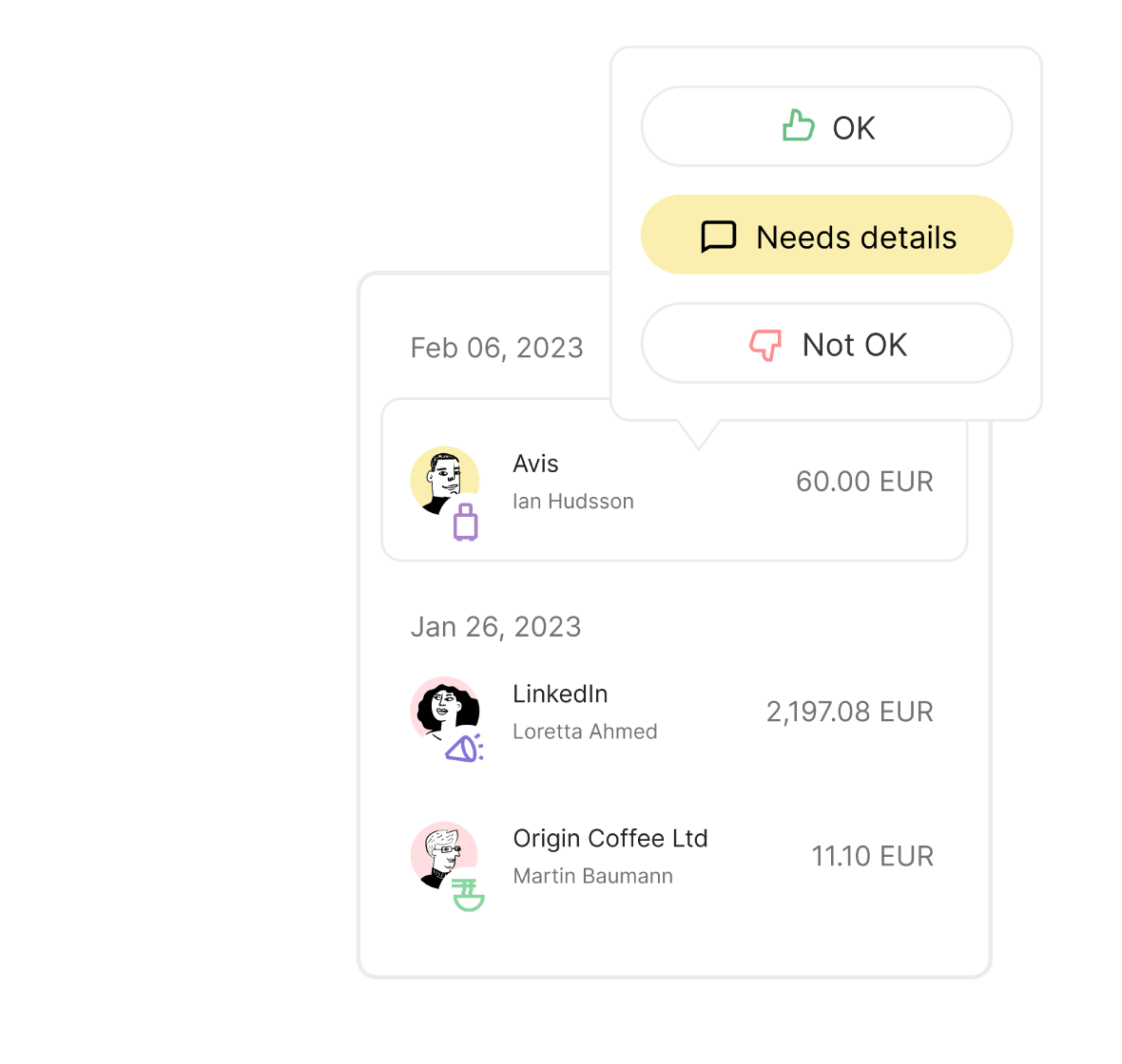 Näe nopeasti yrityksesi kulutus, kattaen kaiken päivittäisistä yrityskuluista aina ohjelmistotilauksiin asti, kuluraporttiemme avulla. Tarkasta tiedot reaaliajassa, ja jonkin puuttuessa, saat lisätietoja muutamalla klikkauksella.