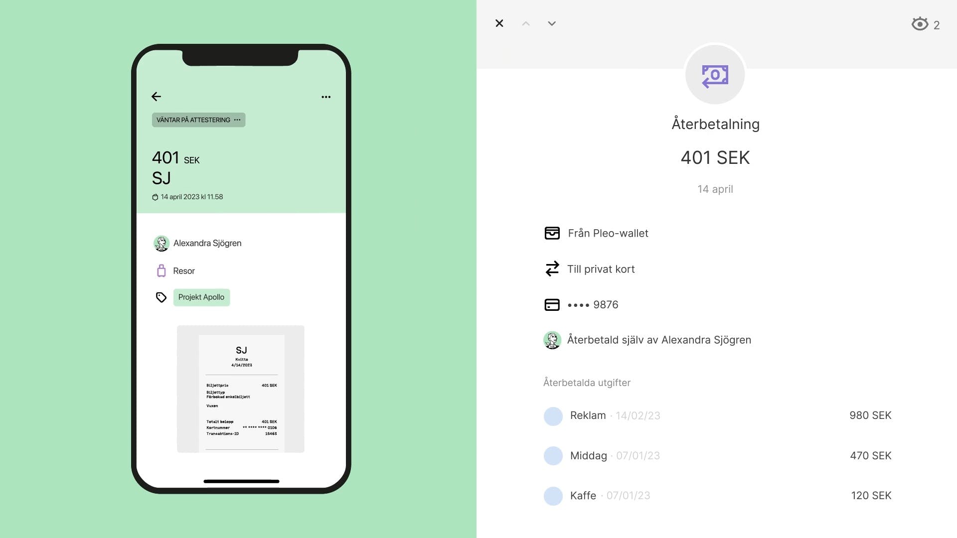 Alla medarbetare behöver kanske inte ett eget företagskort. Med Pleo behöver de personerna aldrig ligga ute med pengar för egna utlägg speciellt länge. De lägger bara till utlägget i Pleo-appen, och så fort utlägget är godkänt blir de återbetalda.